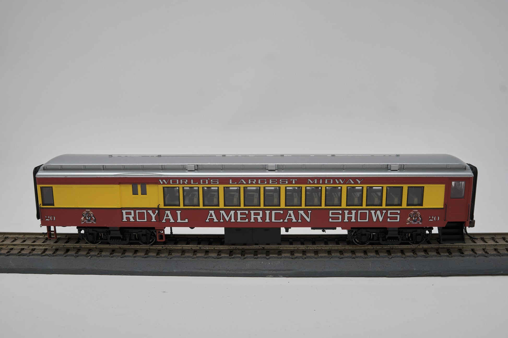 Step right up and experience the magic of mid-century Americana with this beautifully decorated Branchline Commuter Combine Car themed after the legendary Royal American Shows! This HO scale model captures the bold, colorful aesthetic of one of the largest traveling carnivals in North America, which crisscrossed the country by rail from the 1920s through the 1970s. This unique car features eye-catching graphics and a layout reminiscent of the modified passenger cars used by RAS to transport performers, staff, and equipment from town to town.