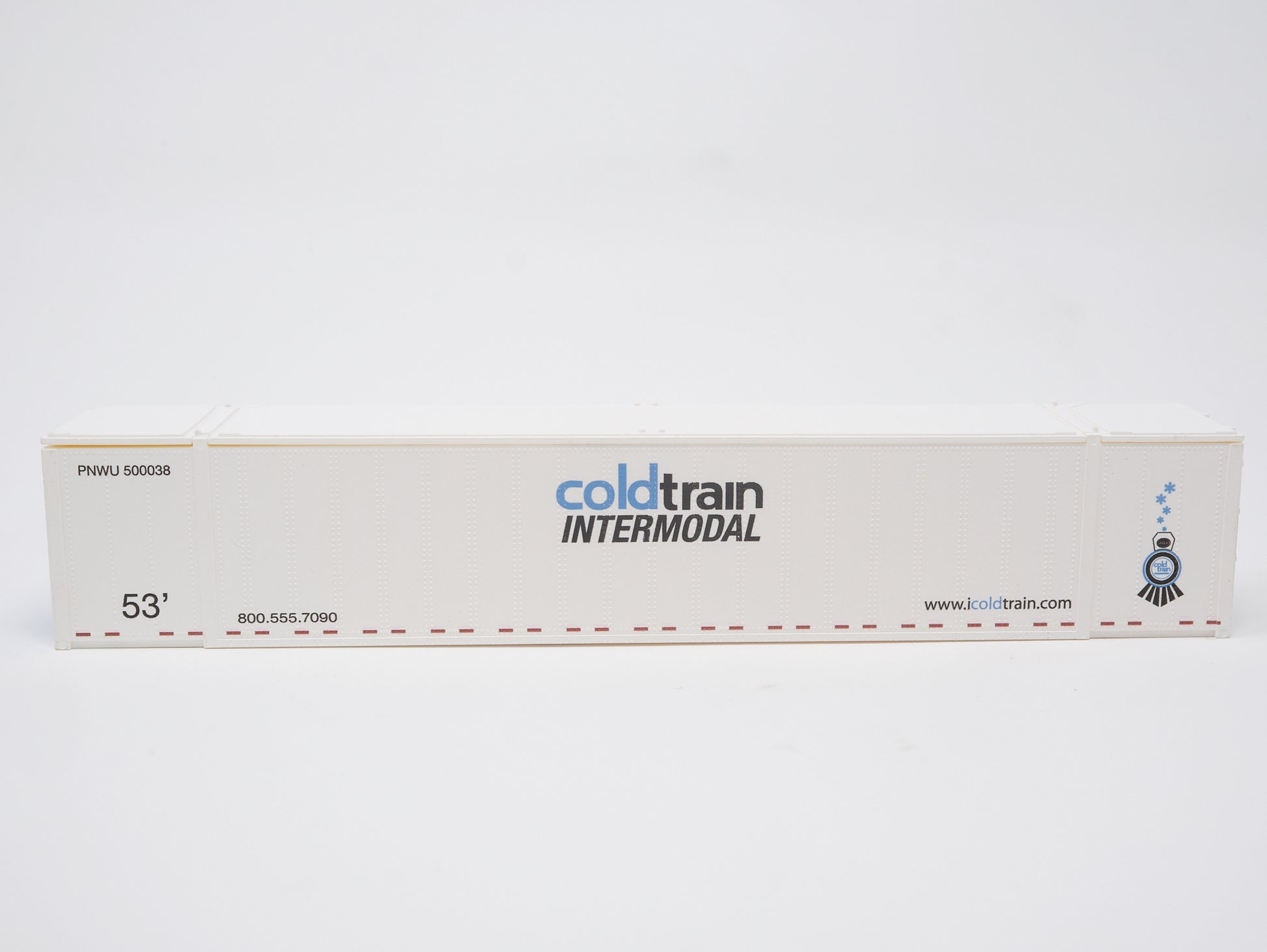 Expand your HO scale intermodal operations with these 53-foot Cold Train Refrigerated Containers, decorated in bright white with the bold Cold Train logo. These containers replicate the specialized equipment used in North American intermodal service to move fresh produce and other perishable goods efficiently across long distances.