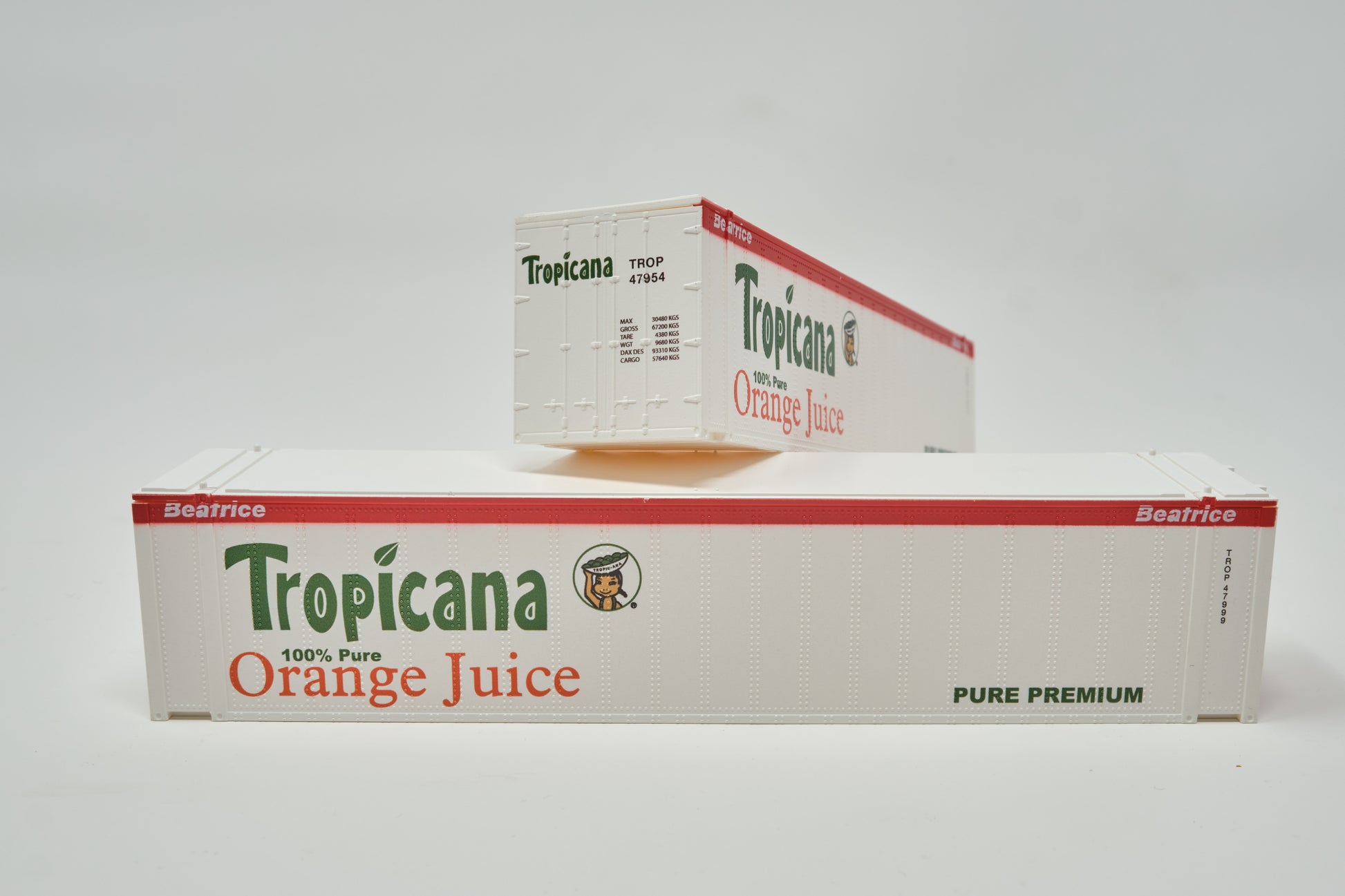 Add a splash of color and classic branding to your HO scale intermodal trains with these 45-foot Tropicana Refrigerated Containers. Decorated in bright white with bold green and orange Tropicana “100% Pure Orange Juice” graphics and mascot artwork, these containers replicate the iconic reefers used to transport fresh orange juice across the country.