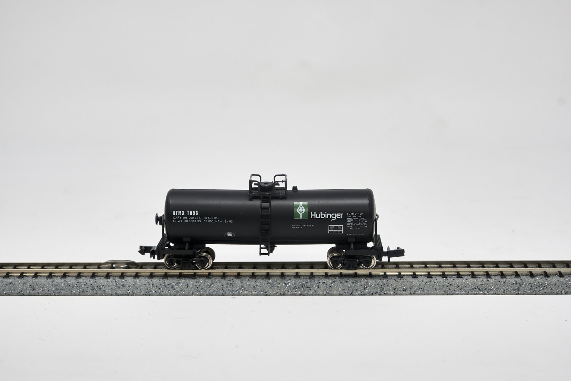 Enhance your N scale freight operations with this 40' Funnel Flow Tank Car from Con-Cor, proudly displaying the "Hubinger" road name. This car is a model of the innovative "Funnel Flow" design, engineered for efficient and rapid unloading of liquid commodities.