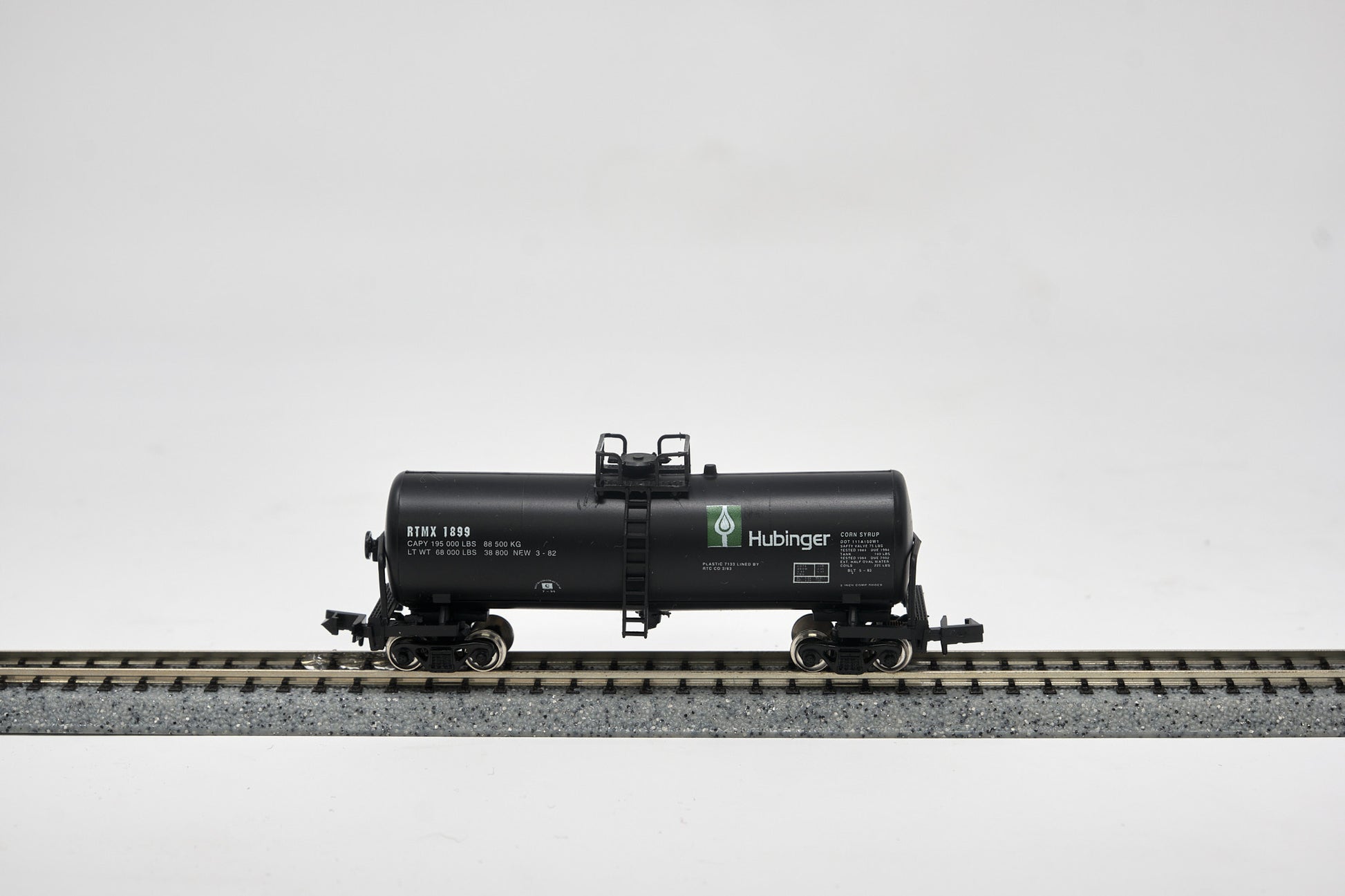 The "Funnel Flow" tank car, first introduced in 1967 by Union Tank Car Company, revolutionized the transport of thick liquids. Its sloped design ensures that contents like corn syrup, chemicals, and other viscous materials flow out more completely and quickly than from a standard flat-bottomed tank car. The "Hubinger" livery represents a classic era of industrial rail transport, making this car a historically significant and visually interesting addition to your layout.