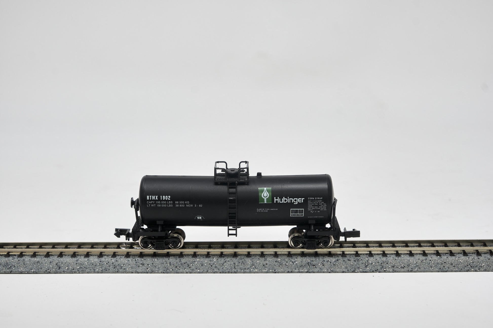 The "Funnel Flow" tank car, first introduced in 1967 by Union Tank Car Company, revolutionized the transport of thick liquids. Its sloped design ensures that contents like corn syrup, chemicals, and other viscous materials flow out more completely and quickly than from a standard flat-bottomed tank car. The "Hubinger" livery represents a classic era of industrial rail transport, making this car a historically significant and visually interesting addition to your layout.
