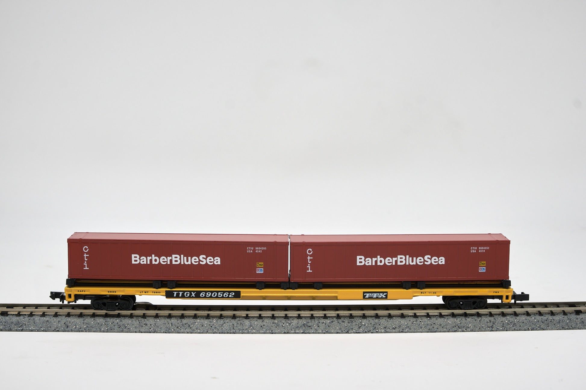 Experience the vibrant era of intermodal shipping with this N-Scale 89-foot Flatcar, authentically configured as a Trailer Train. This highly detailed model features realistic BarberBlue Sea sea containers, perfectly capturing the look of modern freight transport. Ideal for expanding your contemporary N-Scale railroad, it represents the efficiency and global reach of containerized cargo movement.