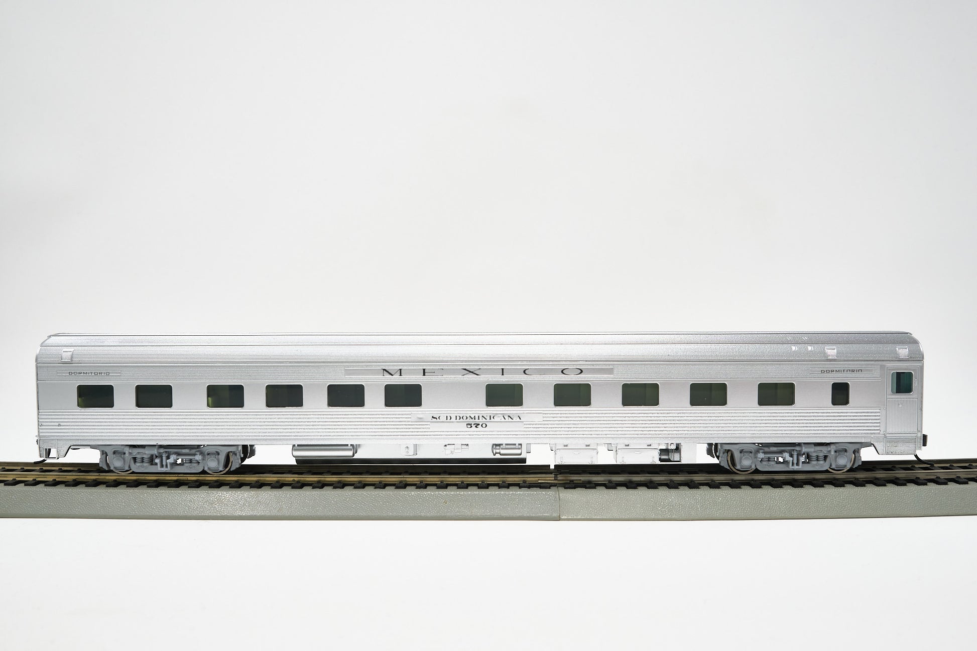 This HO scale 85-foot passenger car from the Walthers Mainline series features a custom-applied “Mexico Scheme”, inspired by the iconic styling of mid-century Mexican intercity passenger trains. During the height of Ferrocarriles Nacionales de México (NdeM) operations, passenger cars often displayed hand-painted lettering and bold, regional color schemes, giving the trains a distinctive and vibrant appearance unique to Mexico’s rail system.